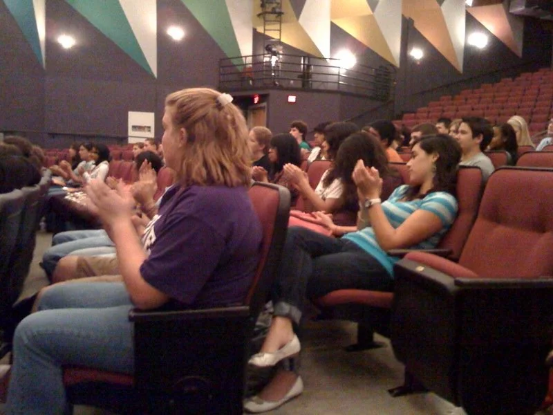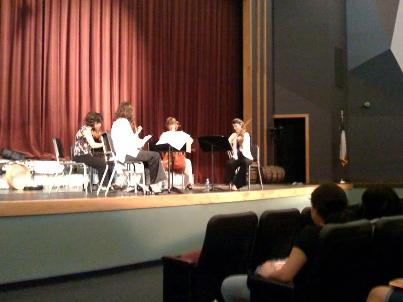 As the Lark Chamber Ensemble began setting up in the Reagan performing arts building, students watched with particular interest as Yousif Sheronick pulled out different percussion instruments. Orchestra and band students streamed in along with an economics teacher and his class. Yousif began the program by displaying what appeared to be a drum and describing how he had acquired it in Cairo, Egypt after a 2+ hour time of drinking tea with the shop owner and negotiating the price. Kathryn Lockwood, violist, introduced each Lark member and described what the audience would hear during Jennifer Higdon’s “An Exaltation of Larks for String Quartet”. Students had been scanning the October 4 SACMS concert programs distributed as they entered and seemed to realize that “different” music would be performed. The Lark played much of the October 4 program, albeit abbreviated. Before each piece was played, a member of the ensemble spoke to the audience about the composer and the music. When Kathryn told them about Daniel Roumain’s “String Quartet No. 5 ‘Parks’ “ also known as “Klap Ur Handz”, she explained that the Lark had commissioned the music in 2006. She asked for their help in placing Rosa Parks in historical perspective, noting that she had grown up in Australia. And then, just as she had done the previous day, she explained this was an interactive piece of music, with the audience needing to clap at many points during the music, albeit with her guidance. The students and teachers present definitely got into the music. Besides clapping during the Roumain work, the audience gave the Lark a rousing round of applause at the end of the concert.