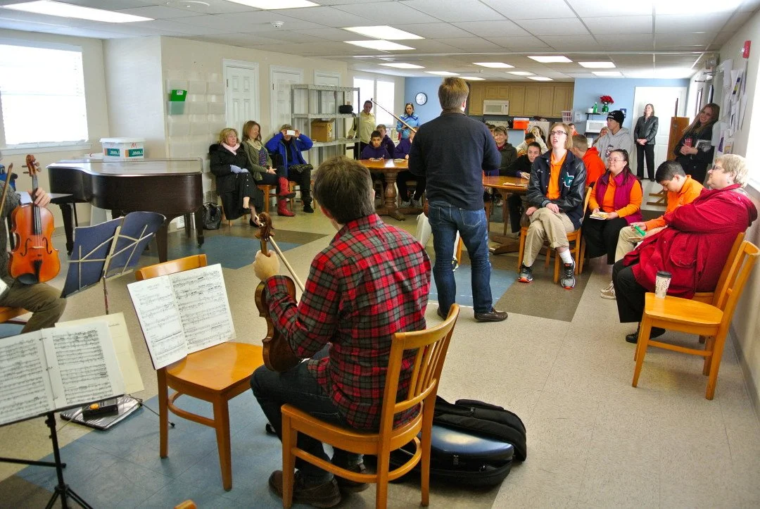 A most successful Sunday afternoon concert was followed by an enjoyable dinner for the Quartet and SACMS Patrons. The Quartet discussed their forthcoming performances in Amsterdam and Italy and also their instruments. Outreach had been scheduled for the following morning at the Monarch Academy, a school dedicated to the care of special needs students. Temperatures in the 30’s and a wind made for a cold early morning trip. A warm welcome at Monarch soon dispelled any lingering chills. The musicians set up their instruments and the students arrived with the staff of the school. There was a hum of anticipation as the students went through the programs from Sunday’s concert.