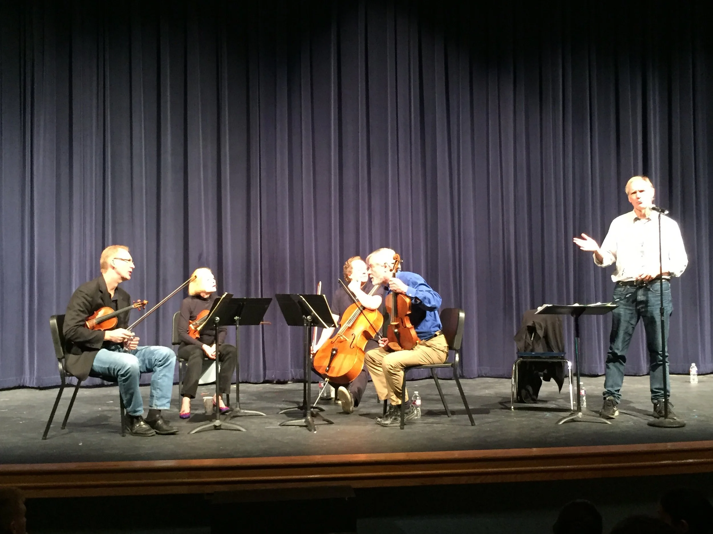 Mr. Sleigh read some poetry during the educational concert on Monday and explained how he chose the poems. The mutual respect and synchronicity of spirit between the musicians and the narrator was palpable to all. The quartet played portions of Shostakovich Quartet No. 8, Bach from Well-Tempered Clavier, Bartók Quartet No. 6, and Beethoven Op. 95 Serioso, all music they chose to express some aspect of war. Or in the instance of the Bach work, peace.