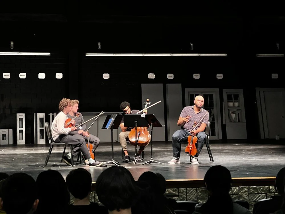 On Monday April 24, 2023, a perfect April day, the Isidore String Quartet arrived at Johnson High School, set up on the stage of their impressive, acoustically treated theater, and began to warm up. “Bach, Childs, Price, Haydn?” violist Devin Moore confirmed with the others, the order of works they were planning to perform. The door to the theater opened, and 40 students filed in, each grabbing a program on their way to the first three rows. Eagerness showed in their eyes as they politely waited for the event to start.