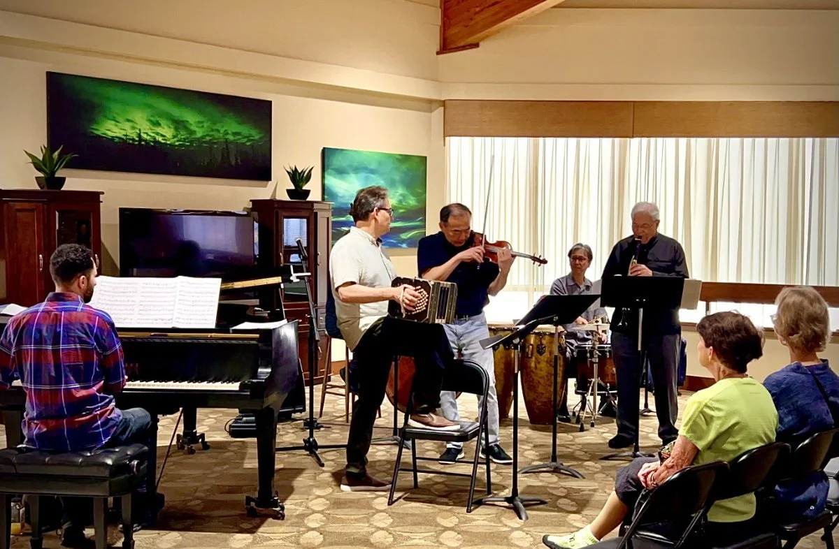 For the 50-minute outreach program at Blue Skies, deciding what to play was easy. With an eclectic program of Argentinian music ready to go, it was only a matter of selecting works that paired well together. Decisions were made just minutes before the concert began, and there was a casual sense of improvisation and ease among the group that revealed how close and relaxed they were with one another. But don’t confuse their casualness with carelessness. After a quick setup and a brief welcome by SACMS President Randy Glickman, they launched into Astor Piazzolla’s nuevo tango work Michelangelo 70 with all the crisp vitality and irresistible groove one would expect from a world-class band.