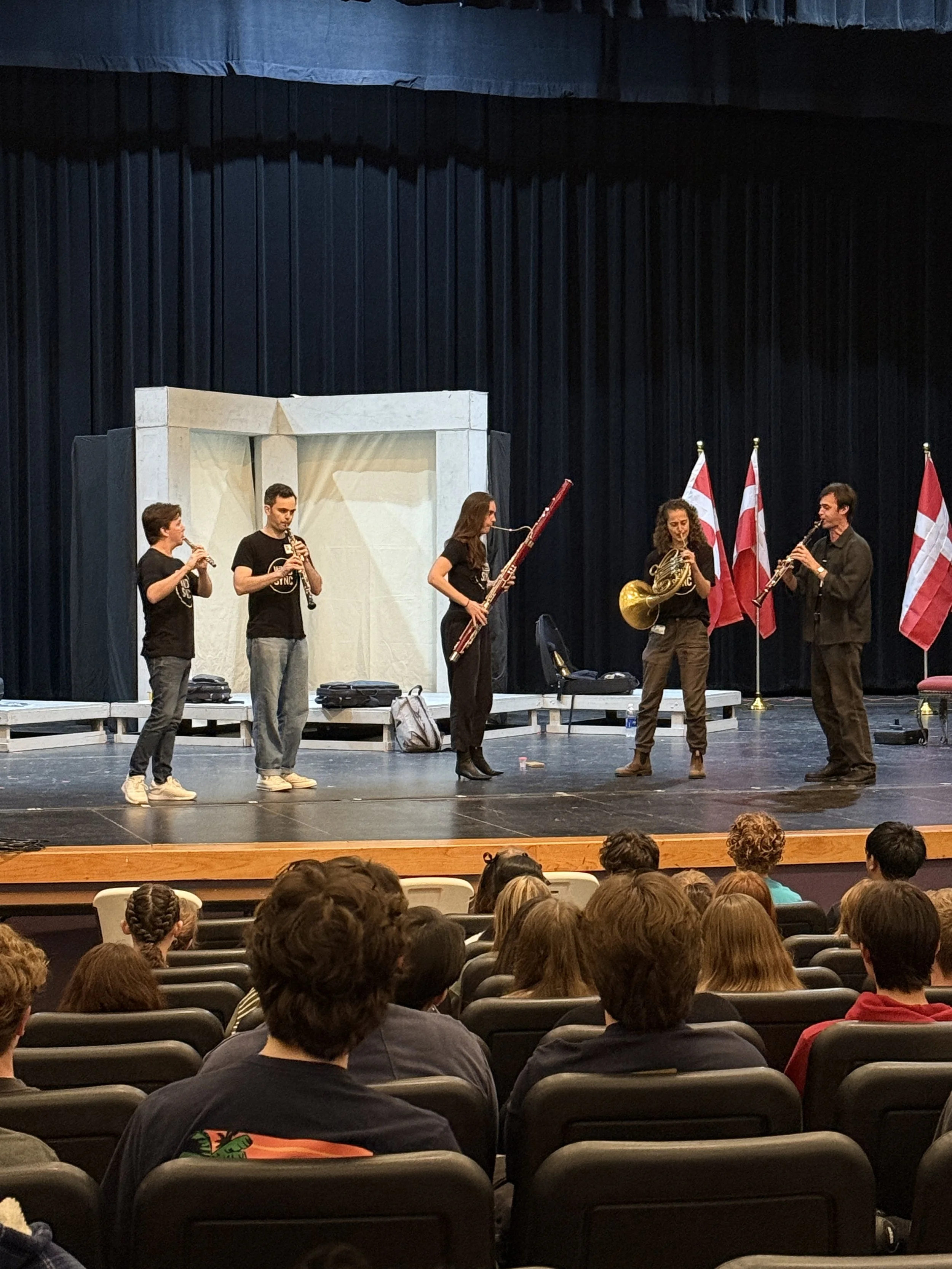 SACMS President Daniel Anastasio welcomed the students and briefly introduced the organization, reminding them that SACMS concerts are always free for students. He mentioned the previous day’s concert, which featured Gershwin’s Rhapsody in Blue and other American works, before introducing WindSync. The quintet explained that although they now perform internationally, they actually began as a student ensemble at Rice University seventeen years ago. That origin story resonated with the students in the room, who were just beginning to consider careers in music themselves. Feeling their attention, WindSync immediately engaged the audience with questions about grade levels, instrumentation, and chamber music experience. When they learned the audience consisted primarily of Reagan’s woodwind students, they joked that they were glad to be “among friends.”